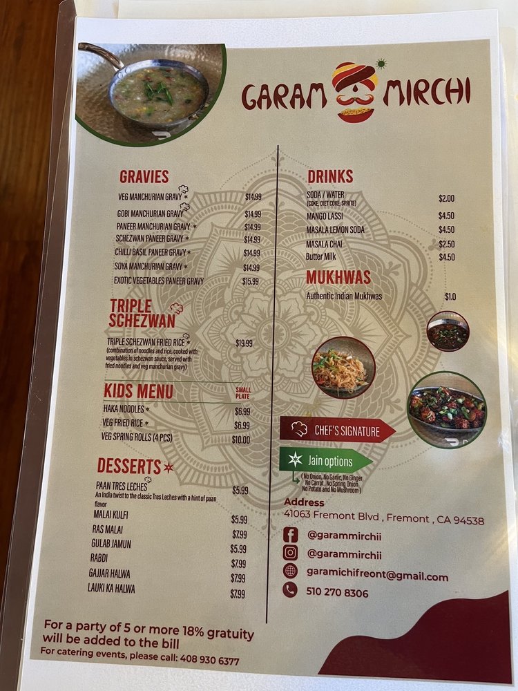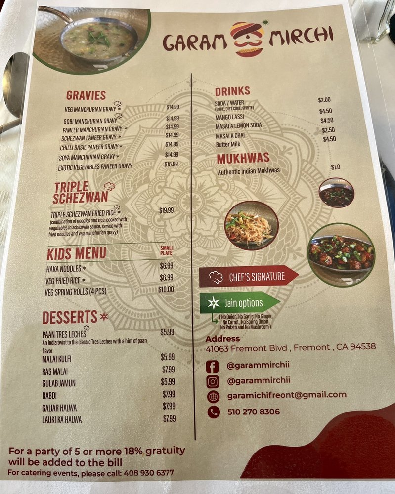 Garam Mirchi Pure Veg Indo-Chinese and Rajasthani Cuisine is a delightful fusion of Indian and Chinese flavors, all served in a purely vegetarian setting. Located in Fremont, CA, this restaurant offers a variety of vegan and vegetarian options, making it a perfect spot for those with dietary preferences. With amenities like outdoor seating, wheelchair accessibility, and free Wi-Fi, Garam Mirchi ensures a comfortable dining experience for all guests. The menu features a selection of dishes that showcase the rich culinary heritage of both regions, from spicy Indo-Chinese favorites to traditional Rajasthani delicacies. Whether you're looking for a casual meal or planning a special event, Garam Mirchi has something for everyone. Don't miss the chance to savor the unique flavors and exceptional hospitality at this Asian-owned gem.