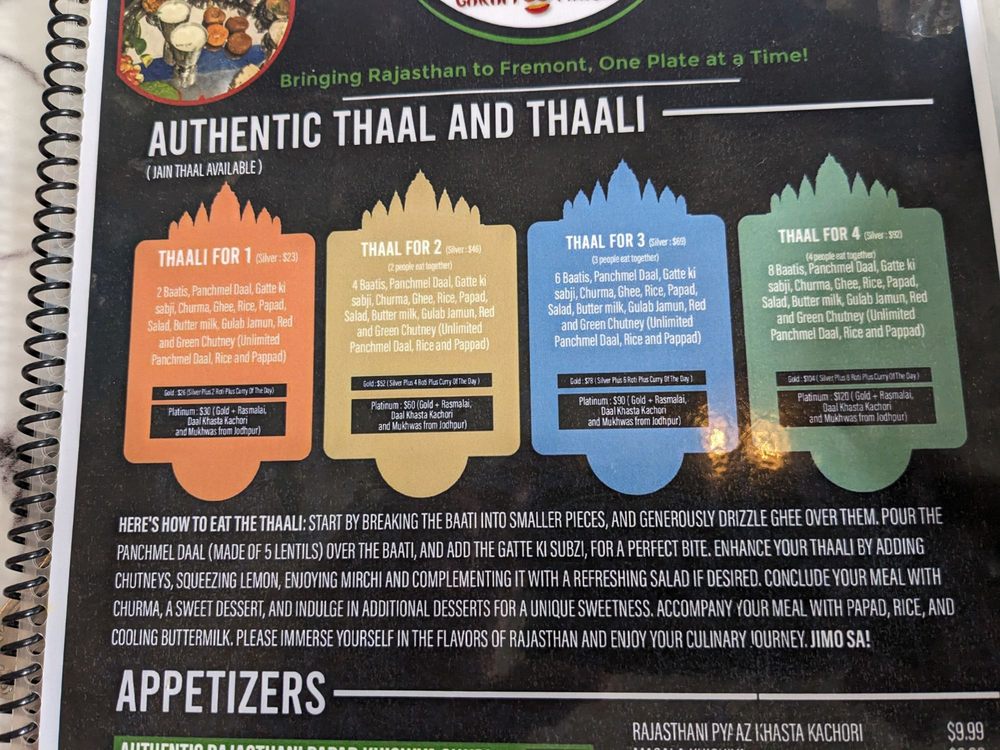 Thaali includes Baati, Panchmel Dal ( Oz), Gatte ke Sabzi( Oz), Churma ( Oz), Rotis, Curry Of The Day. Appetizers, Ghee, Rice ( Oz), Papad, Drink, Dessert, Red & Green Chutneys, nd Apetizer, nd Dessert